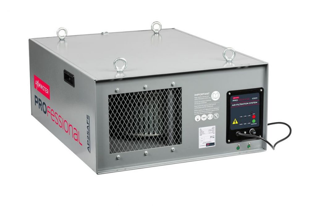 - With a powerful 150W motor, the AP25AFS Air Filter is intended for workshops of 300m³ or less. The air passes through the electrostatic pre-filter into the main pleated filter, filtering 98% of all particles 5 microns in size and 86% of all particles 1 micron in size. It comes with a remote control unit offering three settings for the motor speed and three different time settings of 1, 2 or 4 hours. This allows the unit to run after work has finished to clear the air ready for the next day. The machine runs reasonably quietly with noise levels of speed 1: 62 dB. speed 2: 66 dB. and speed 3: 68 dB.