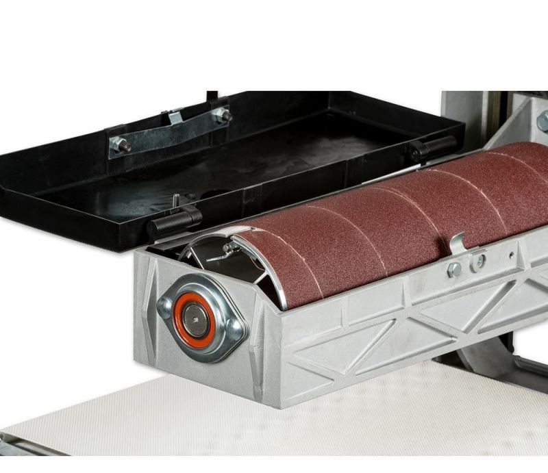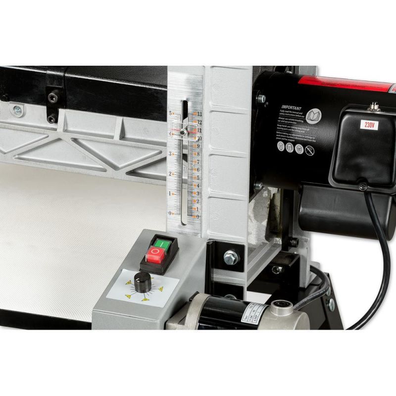 - The open sided design allows wide boards up to 812mm to be sanded by running through from both sides. There is a hand control wheel for the sanding depth, with an indicator scale. A 0.75kW motor drives the drum, with a variable speed unit controlling the conveyor feed speed. The conveyor belt is easy to track, and there are shims provided to ensure that the conveyor belt is parallel to the sanding drum.