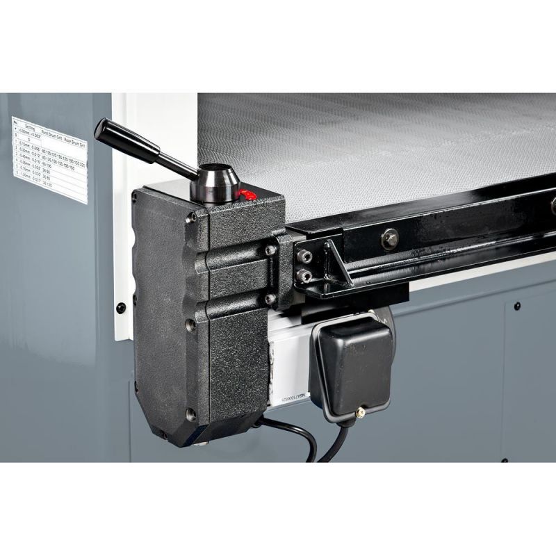- The 150mm diameter drums are precision machined from aluminium castings. The abrasive is wound spirally around the drums and securely held by wedge clamps. Coarser abrasive on the front and finer on the rear. There is a very accurate setting system for the rear roller, allowing easy adjustment to accommodate the different grades of abrasive. Three pressure rollers maintain contact between the work and the conveyor belt. This ensures that the work is held in close contact with the belt, giving safe operation and a uniform thickness to the finished work.