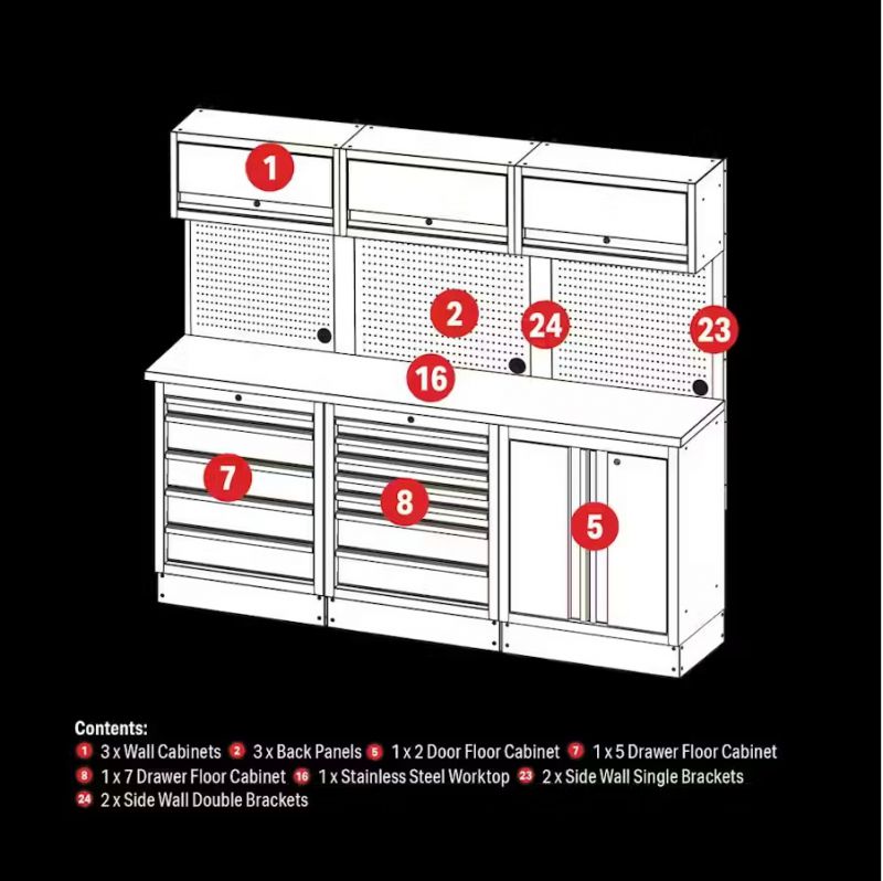 - The BUNKER® 14-piece modular storage combo, available with a hardwood or stainless steel worktop, is the ideal storage solution for garages, workshops, and more. This 2040mm modular combo features a variety of floor cabinets, wall cabinets, pegboard panels, and wall brackets, providing everything you need to transform and optimise your space.