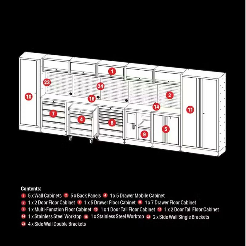 - Our 4915mm modular storage combo features a stainless steel or hardwood worktop, along with a selection of stylish floor cabinets, wall cabinets, pegboard panels, and brackets. BUNKER® modular storage systems are designed for durability, ensuring quality and smart features that simplify tool storage and organisation, making your workday more efficient.
