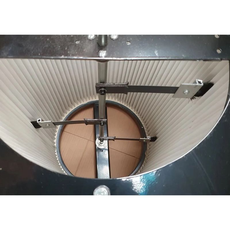 • To prevent clogging of the filter, and keep the air flowing at its maximum rate, there is a built-in paddle cleaning system inside the filter. An electric motor rotates the paddle arms which  agitate the pleats in the filter material, removing dust clinging to the inside. The cleaning system automatically runs every 15 minutes during prolonged use and every time the cyclone is powered down. A cleaning cycle consists of 10 rotations clockwise and 10 rotations anti-clockwise. Perfect for installations where multiple operators are using the cyclone as nobody has to take responsibility for the cleaning.