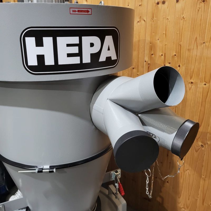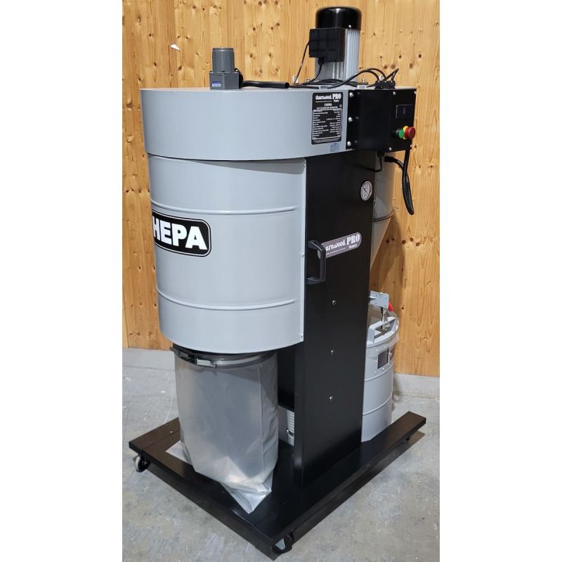 A Pro Series cyclone extractor, which can be run continuously for up to 8 hours. The cyclone design gives consistent performance by collecting dust & chips in the drum, before it passes through the filter. To ensure the filter does not become clogged, an automated filter cleaning system is included.