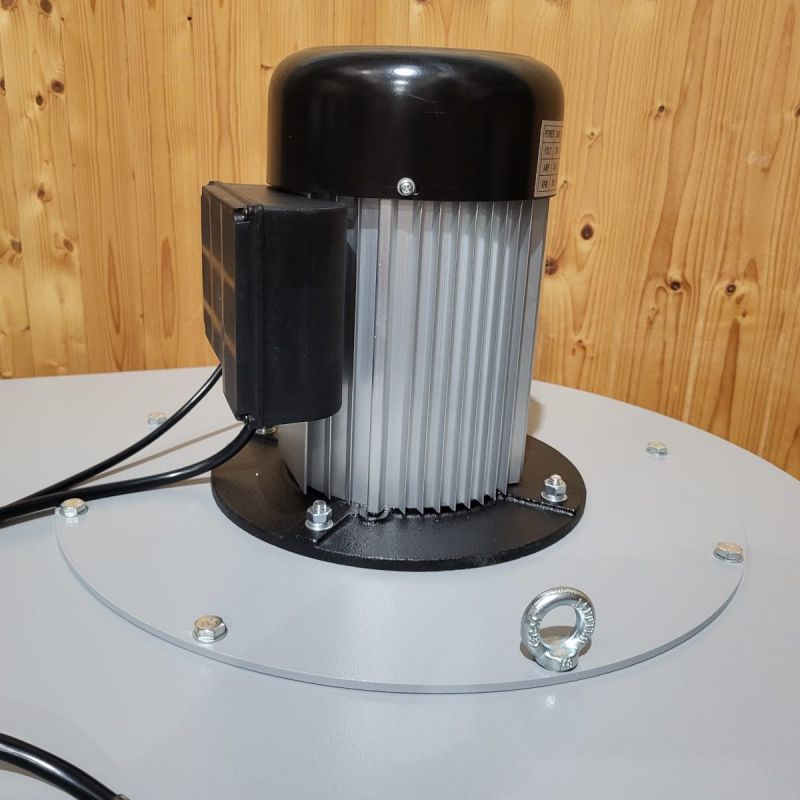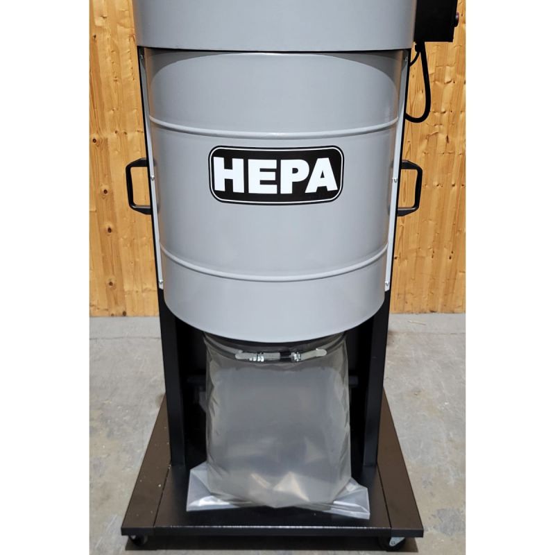 • The steel fan is powered by a quiet 4hp induction motor which draws air into the cyclone barrel and then down into the collection drum where it deposits most of the material collected. The air then flows back up, through the fan housing and then through the cartridge filter. The filter will take out 99% of particles sized at 1 micron or above. A small amount of dust will be collected in the filter collection bag. A quick action strap release the bag for emptying.