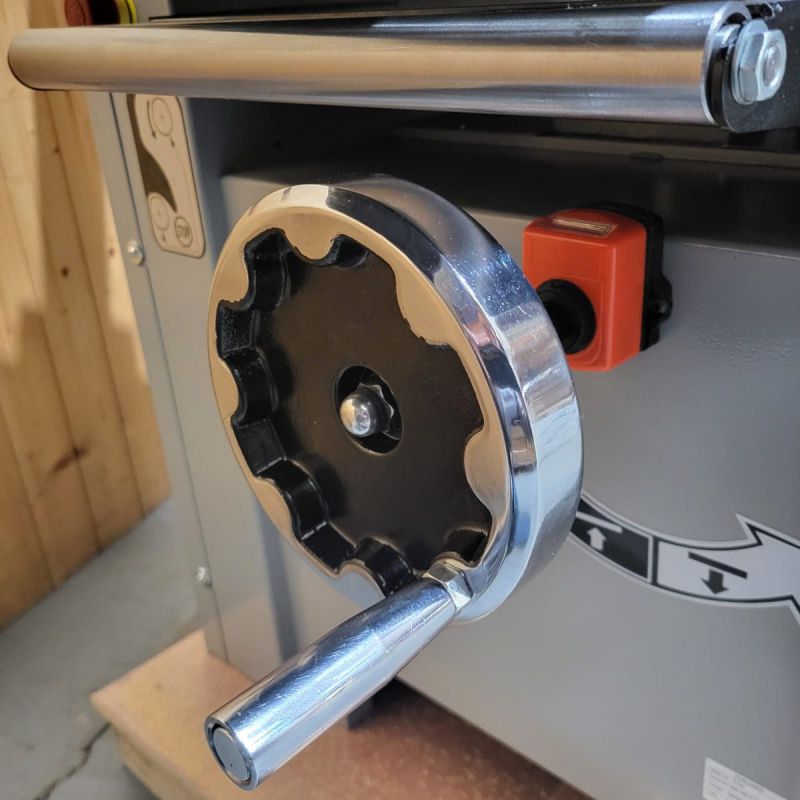 - Setting the thicknessing depth is done by rotating the cast iron hand wheel (1 rotation = 2mm) and reading from the measuring scale or for more precise control the mechanical digital display, accurate to 1/10th of a millimetre. A position lock is fitted which prevents any movement of the bed during the cut.