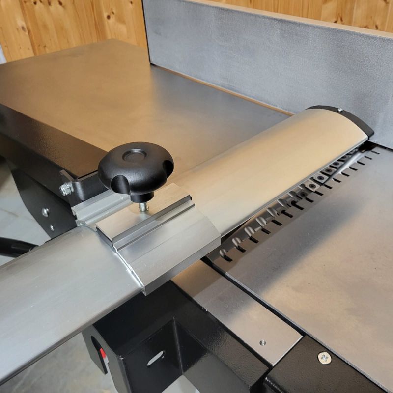 - The extra long cast iron infeed bed is quick to adjust using a lever, with a clear scale to read the setting before locking the position. The bridge guard has simple controls to set the height over the cutters and the gap to the side fence. It can also be lifted up and locked completely out of the way. The side fence is mounted on a sturdy cast iron support bracket. The fence can be positioned anywhere across the width of the cutter block, useful for getting even wear on the cutters when working mainly with narrower materials. The fence can also be tilted back to 45 degrees.