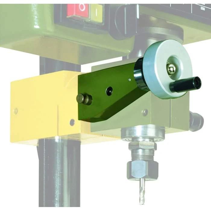 - The clutch system enables feed via either the drill handle or the handwheel.