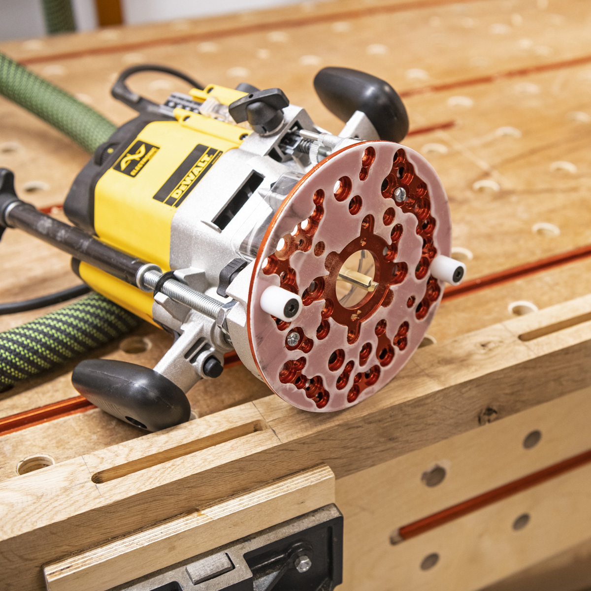 - Some routers can be difficult to match up with suitable guide bushes and a universal sub-base can be the only solution. A round base can be preferable in many circumstances too. The UJK sub-base is precision machined from aluminium and fitted with a low friction surface for ease of use. It is designed to accept standard UJK guide bushes and holes for these are drilled with an M4 thread. It is also designed for mounting to a very wide range of different routers including Bosch, Makita, Elu, Dewalt, Festool, Trend, Ryobi and Hitachi models to name a few and a fixing kit is included to cover a variety of thread types.