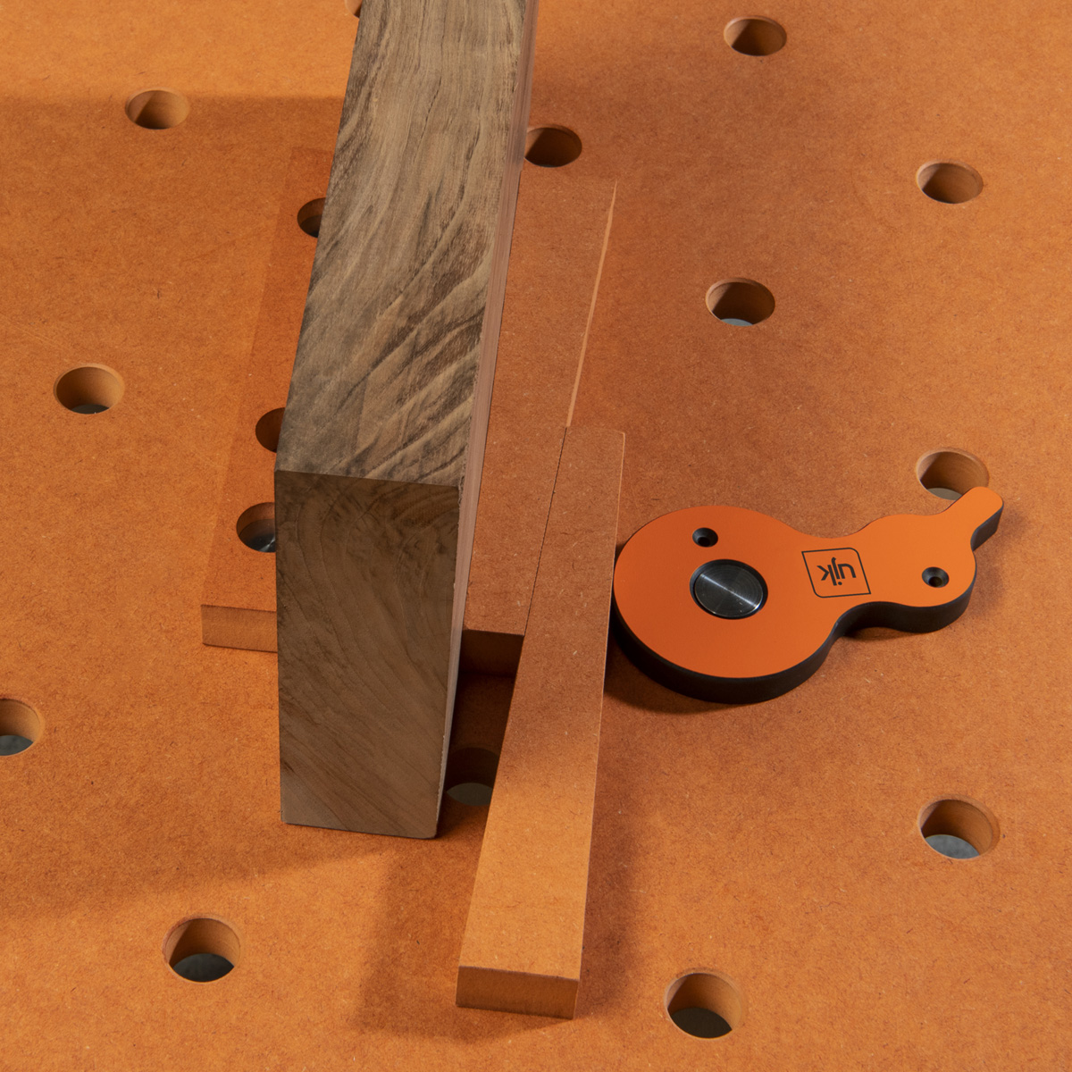 - The Backstop is part of the UJK Cam & Wedge set available separately. The backstop has three dog holes; two spaced at 96mm for lateral or longitudinal positioning on a multifunction table and a third allowing diagonal placement. The UJK Guide Pups with their 12mm projection are the ideal companions. On its own, it makes a useful planing stop etc. Together with a second backstop placed at 90° or diagonally at 45° it can form a useful assembly jig.