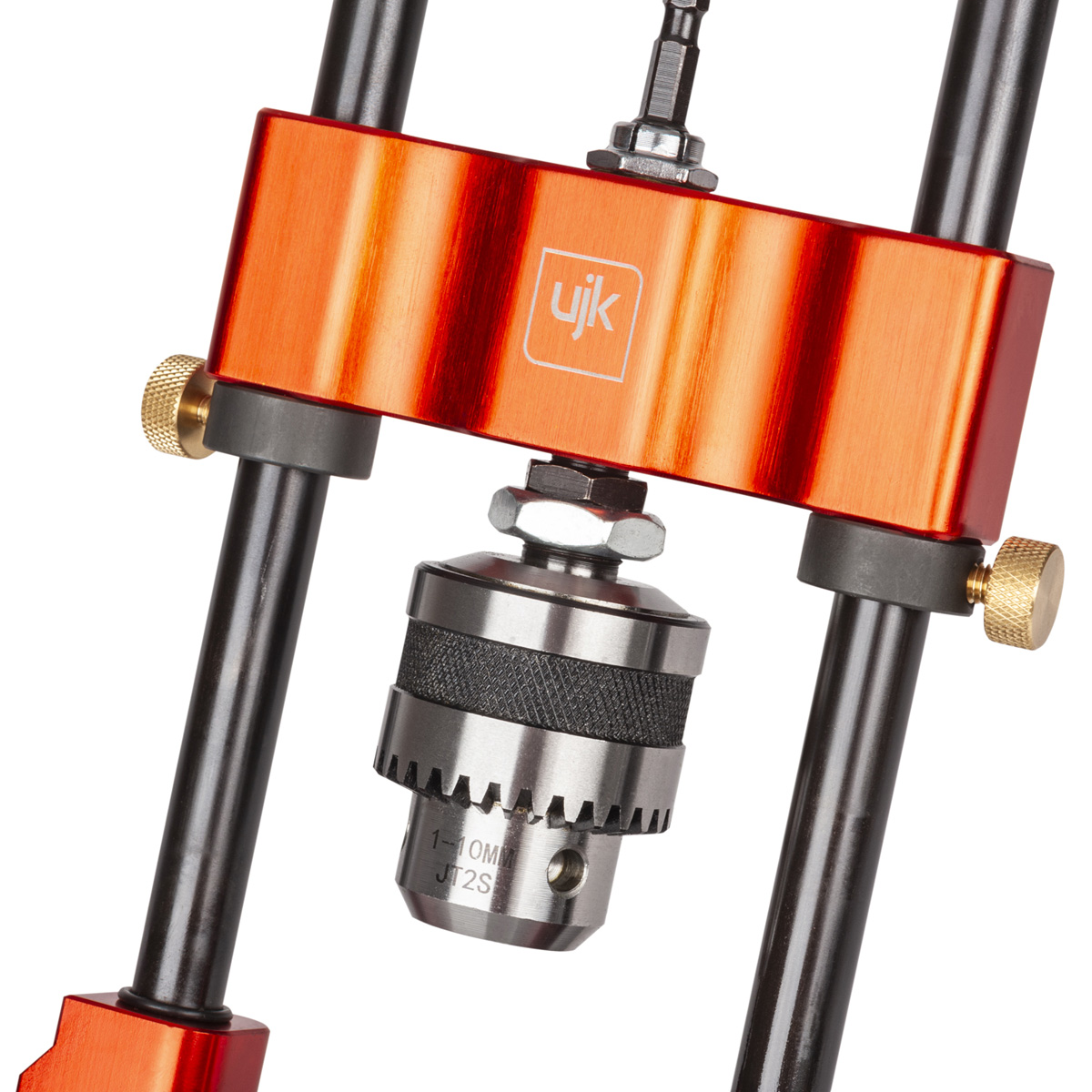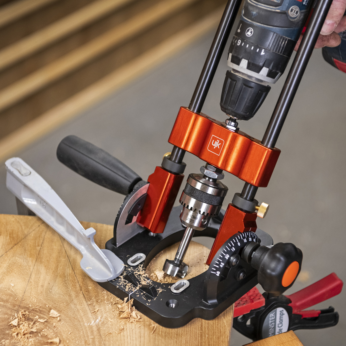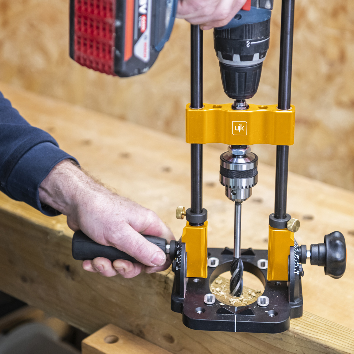 - With the UJK Drill Guide creates a compact, portable pillar drill. Using mains or cordless drill it can accurately drill holes at a wide range of angles, up to 110°. The guide allows you to clearly and easily, drill straight down or at an angle, locking it in place for stability. The guide bars and smooth bushings make sure the drill moves straight and smooth. The depth stop is great for making sure you don't drill too deep or not deep enough.