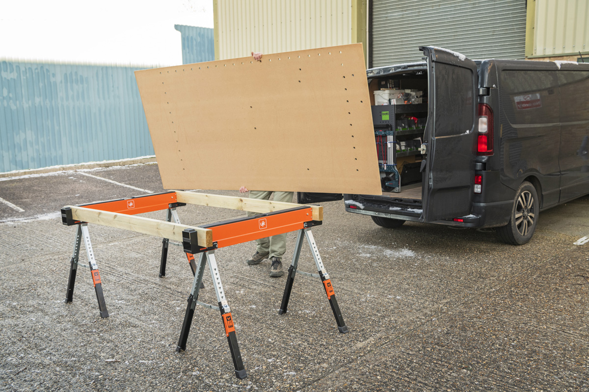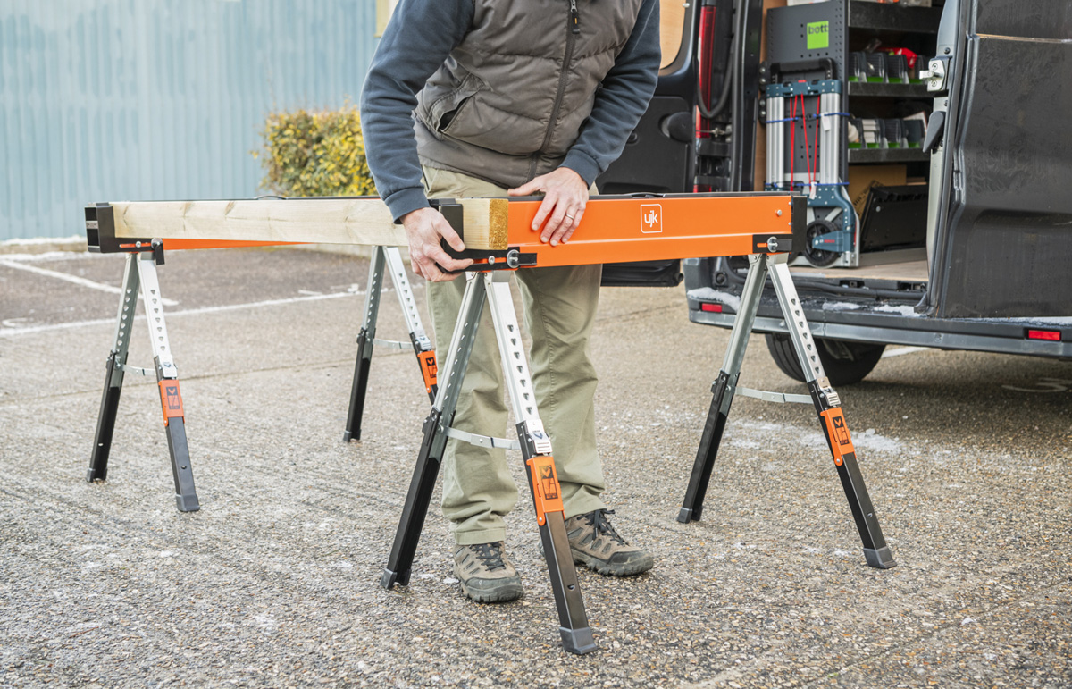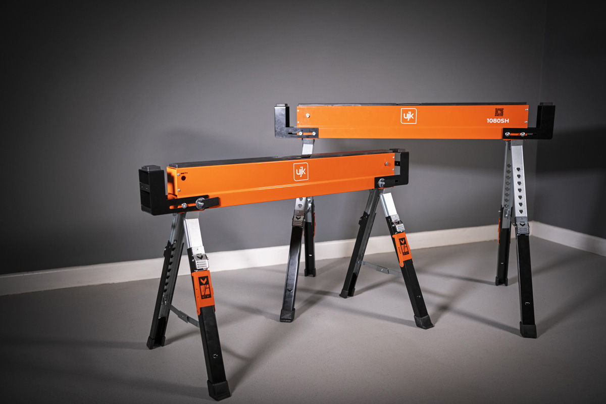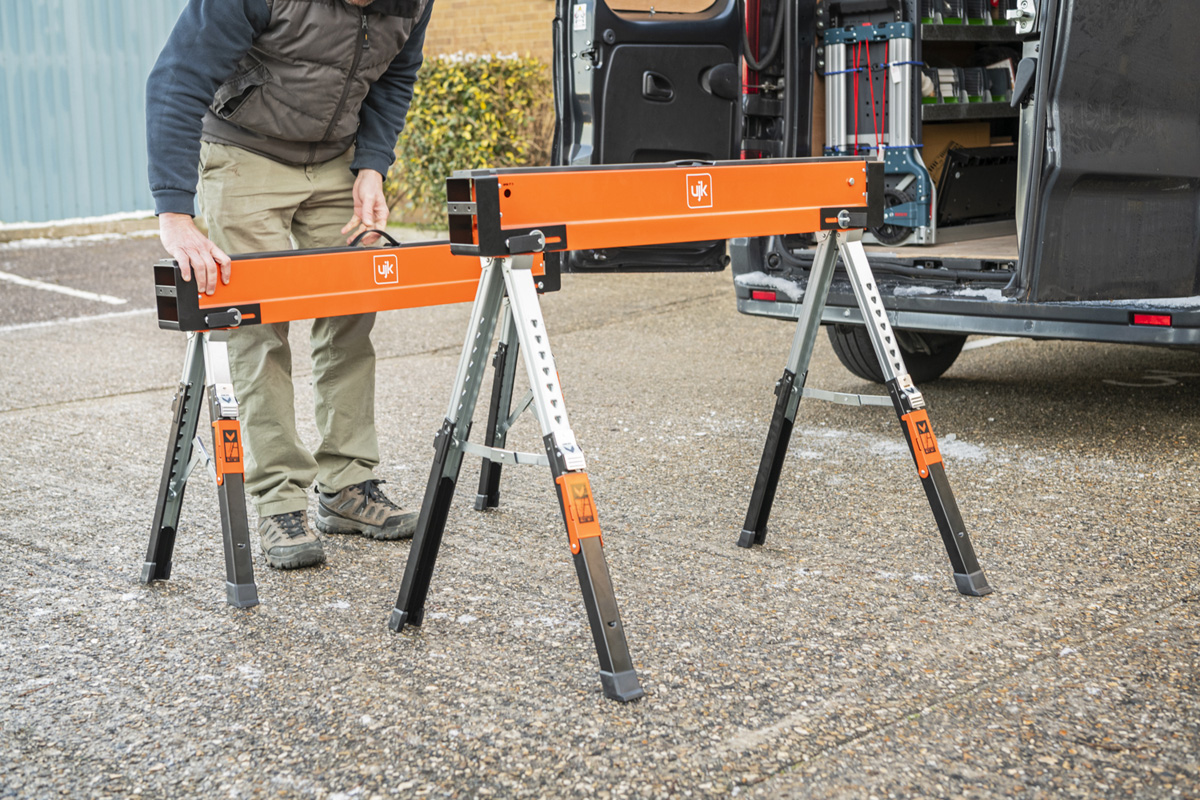 - The UJK Sawhorses, all-steel, folding saw horses, designed for convenience, versatility and durability. Compact and portable, they fit easily into your van or workshop. The legs fold neatly into the top rail and include carry handles for easy transport and storage. Featuring a quick-release button for easy setup, adjustable material support arms, hinged leg brackets, a reinforced top, and telescopic legs for customizable height. With rubber feet for stability and corrosion-resistant coating, each saw horse supports up to 590kg, making them perfect for creating a solid workbench on-site.