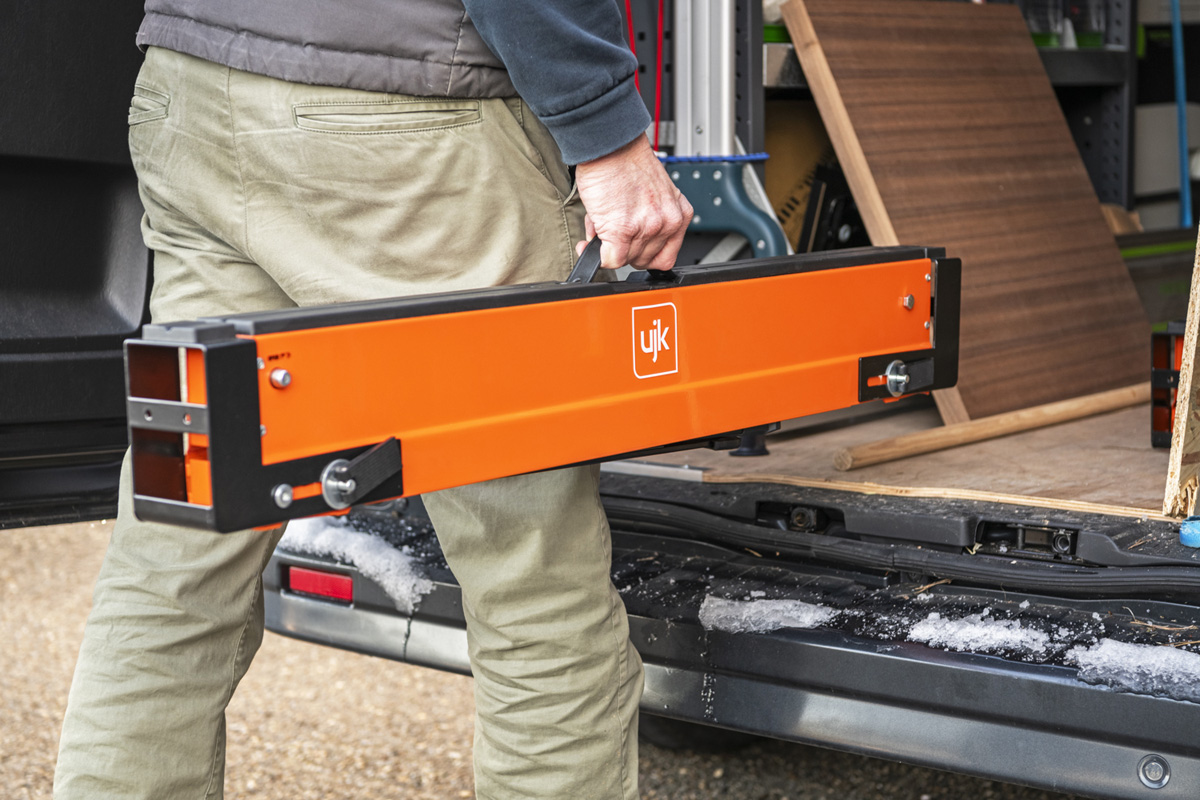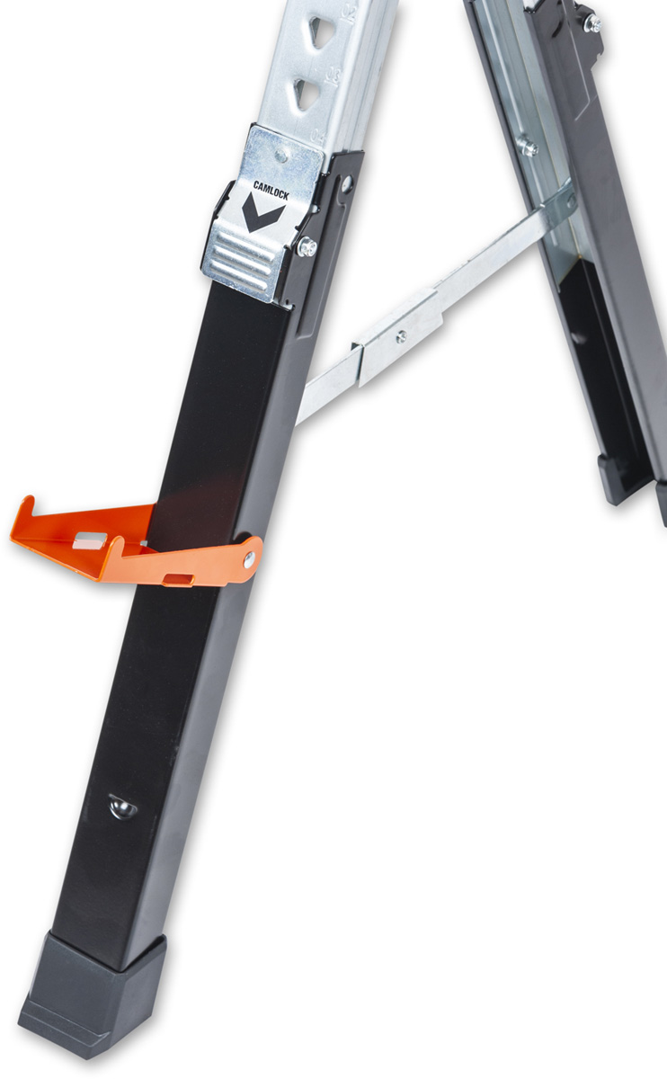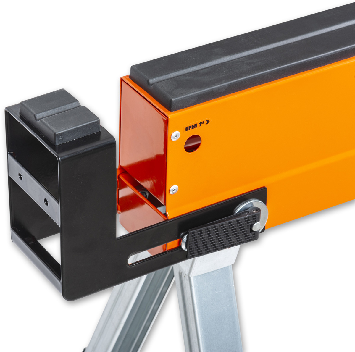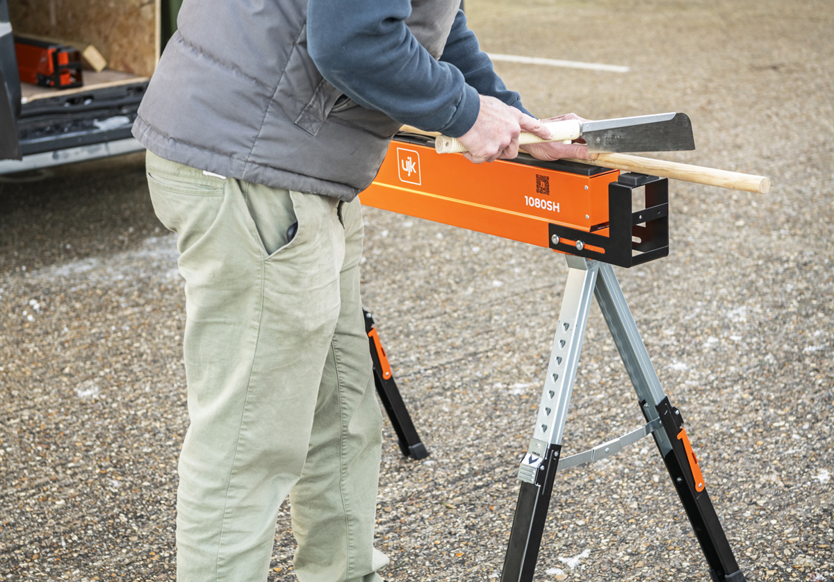 - The UJK Sawhorses, all-steel, folding saw horses, designed for convenience, versatility and durability. Compact and portable, they fit easily into your van or workshop. The legs fold neatly into the top rail and include carry handles for easy transport and storage. Featuring a quick-release button for easy setup, adjustable material support arms, hinged leg brackets, a reinforced top, and telescopic legs for customizable height. With rubber feet for stability and corrosion-resistant coating, each saw horse supports up to 590kg, making them perfect for creating a solid workbench on-site.