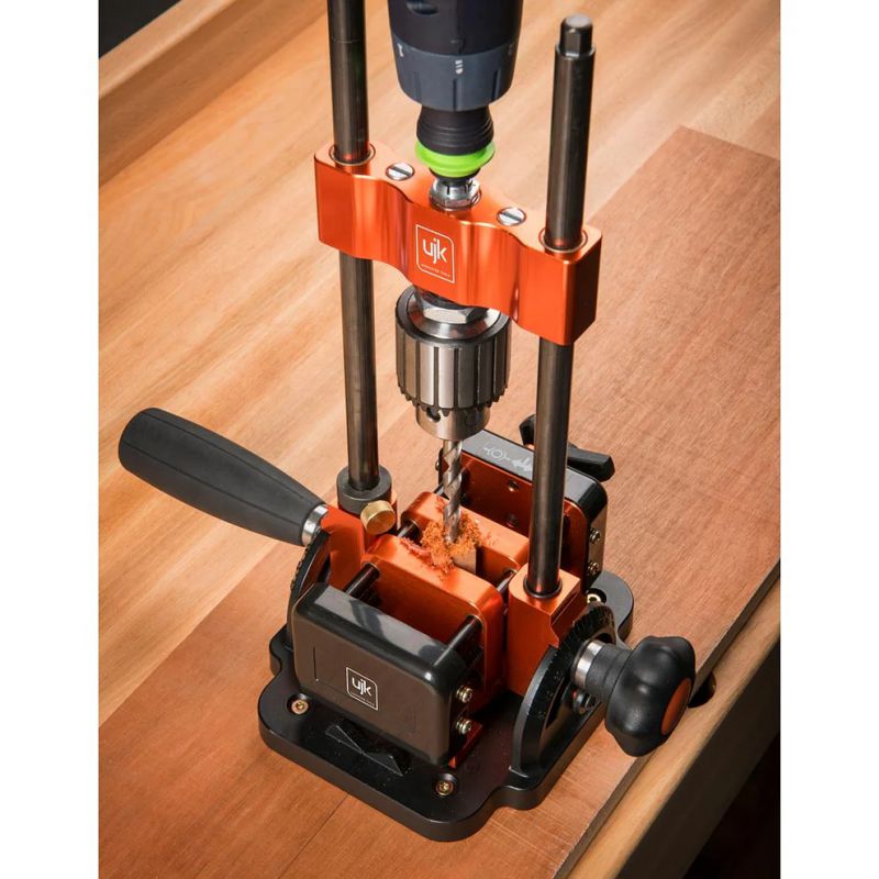 - Made to fit directly onto the UJK Drill Guide, this precisely engineered self-centring vice is equally effective on any small pillar drill. A vee-notch in each jaw securely holds round or square stock perfectly centred and perpendicular. The maximum diameter or diagonal measurement is 45mm, while the fully open jaws provide a maximum capacity of 70mm x 45mm. The jaws run on four steel guide bars, ensuring smooth, consistently parallel movement. Turning the control knob clockwise opens the jaws, and counterclockwise closes them. Threaded holes in the base align with the fixing holes on the UJK Drill Guide, and attaching a sub-base for use elsewhere is straightforward.