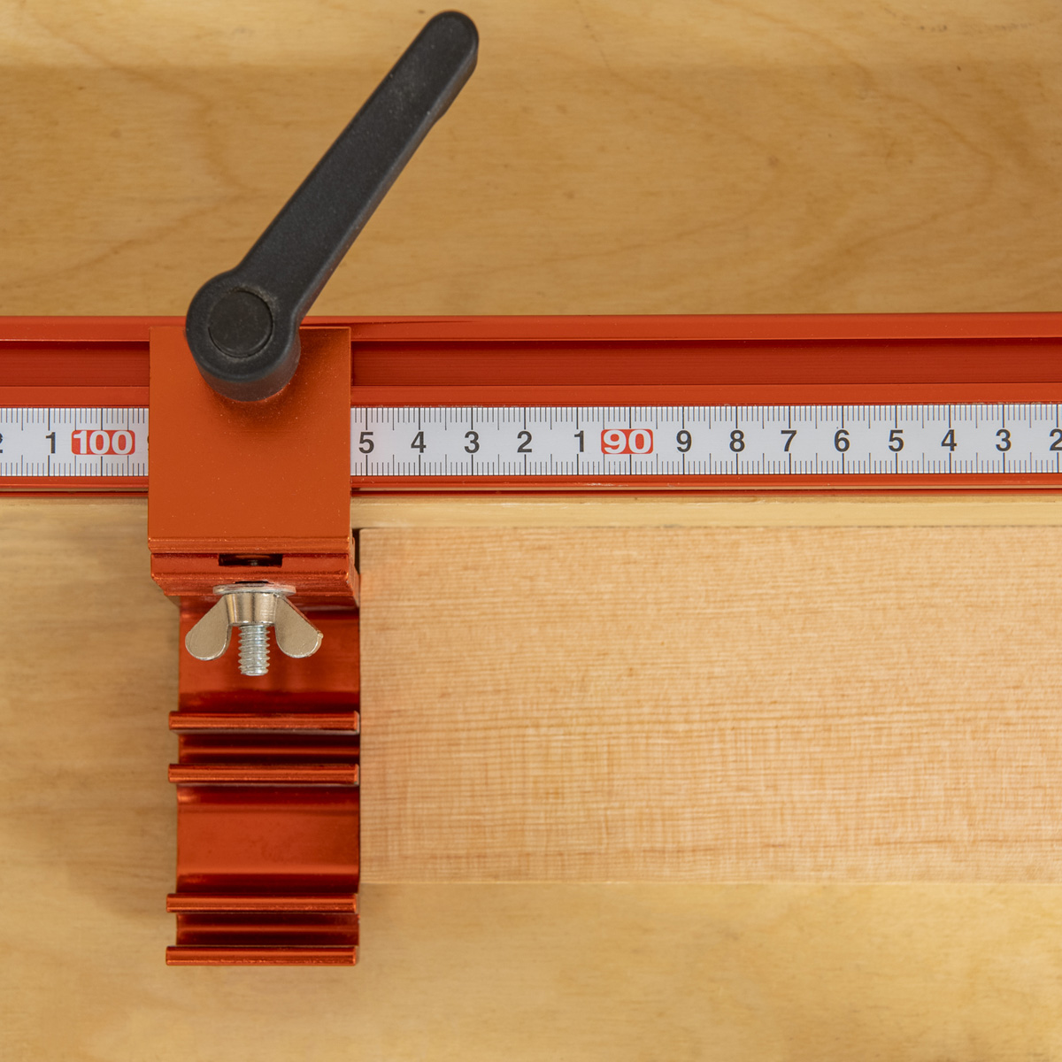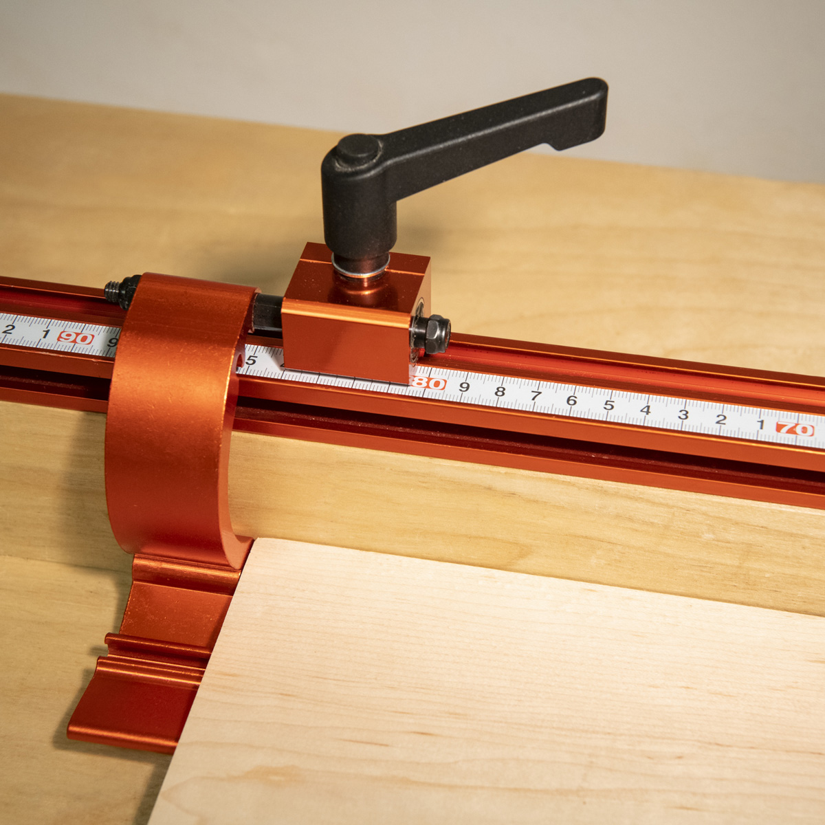 - Extra lengths of track are available should you wish to make a longer fence. The self-adhesive scales sit in a shallow groove on the top of the track. Both 3m long and graduated, one reads left to right, the other right to left. The cut length stops run in the top T-slot. The flip-over is for small runs and the production stop for longer runs.