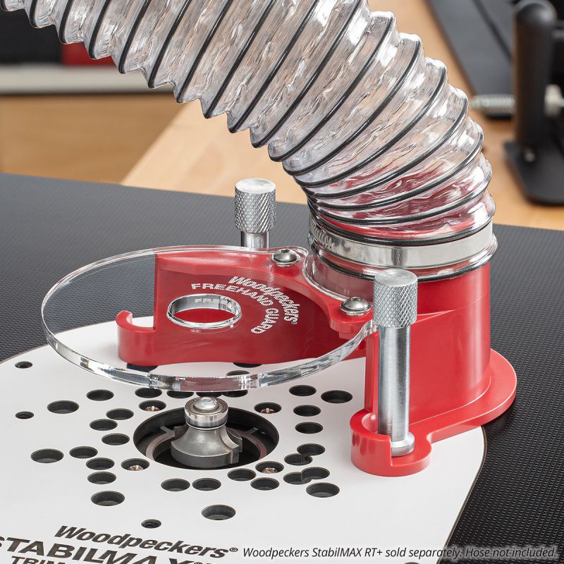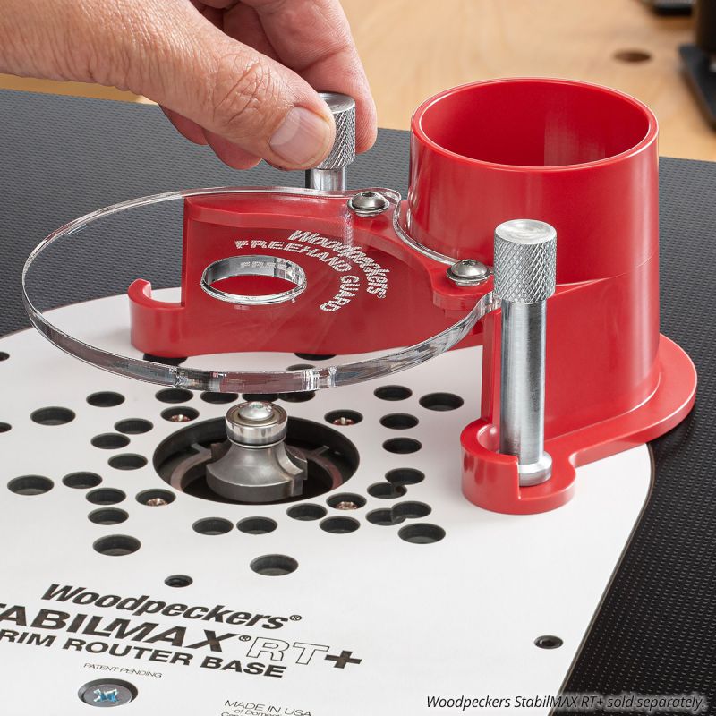 - Woodpeckers Freehand Guard mounts to any Woodpeckers router lift or router plate as well as the StabilMax RT+ router base. It uses 2 of the starter pin threaded holes. Since the starter pin holes are concentric around the opening, you have multiple positions to mount the Freehand Guard…choose the one most comfortable for you and your project.